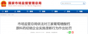 4月14日,国家市场监管总局发布公告称,近日查处一起重大典型的原料药领域滥用市场支配地位案件,对山东康惠医药有限公司、潍坊普云惠医药有限公司和潍坊太阳神医药有限公司3家葡萄糖酸钙原料药经销企业实施垄断行为作出行政处罚,罚没款共计3.255亿元。 葡萄糖酸钙注射液是国家基本药物、临床必需药品,是常用的低价药,注射用葡萄糖酸钙原料药是生产葡萄糖酸钙注射液的基本原料。2019年初,市场监管总局接到举报,